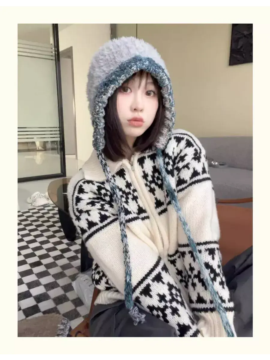 Пушистая шапка с принтом в стиле Y2K. Может быть аналогом съемного капюшона.