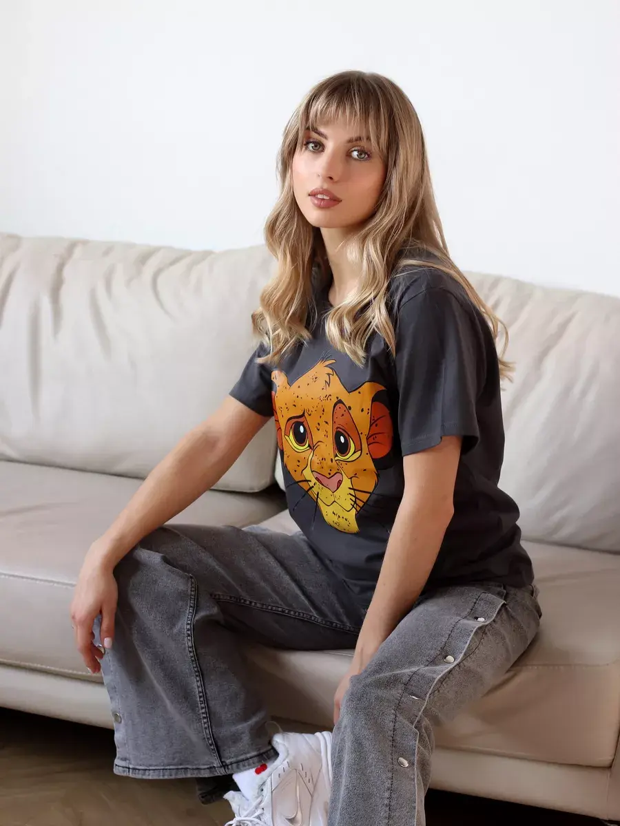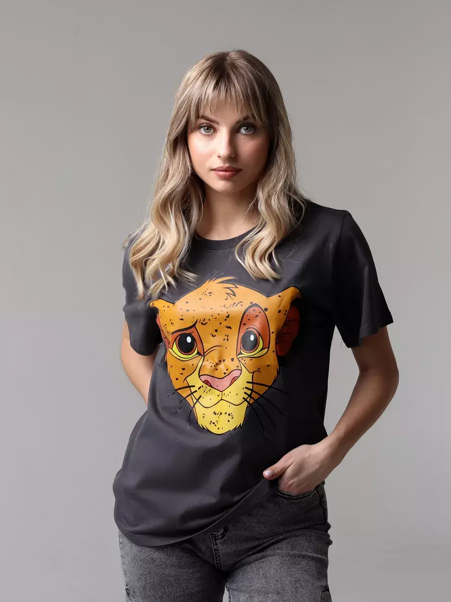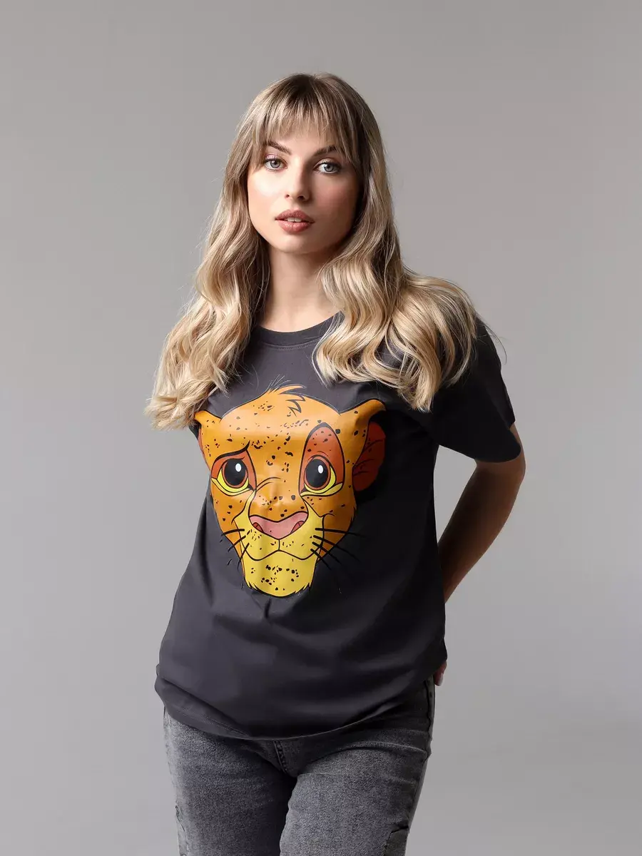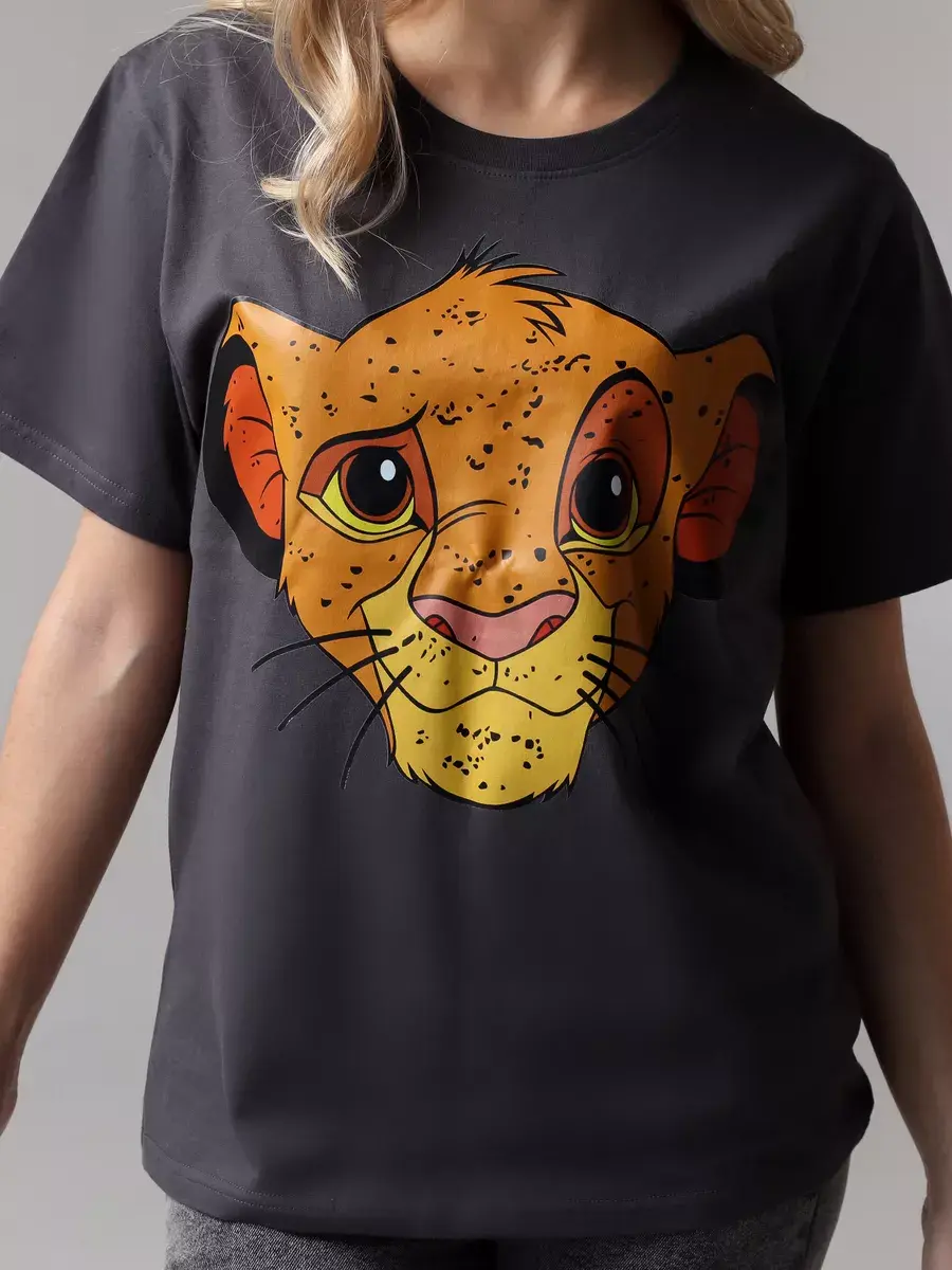 Универсальные базовые цвета - белый и серый, которые легко сочетаются с другими оттенками вашего гардероба. Принт с рисунком Король Лев делает ее милой и привлекательной, и подойдет для подростков. Удлиненная футболка с коротким рукавом.