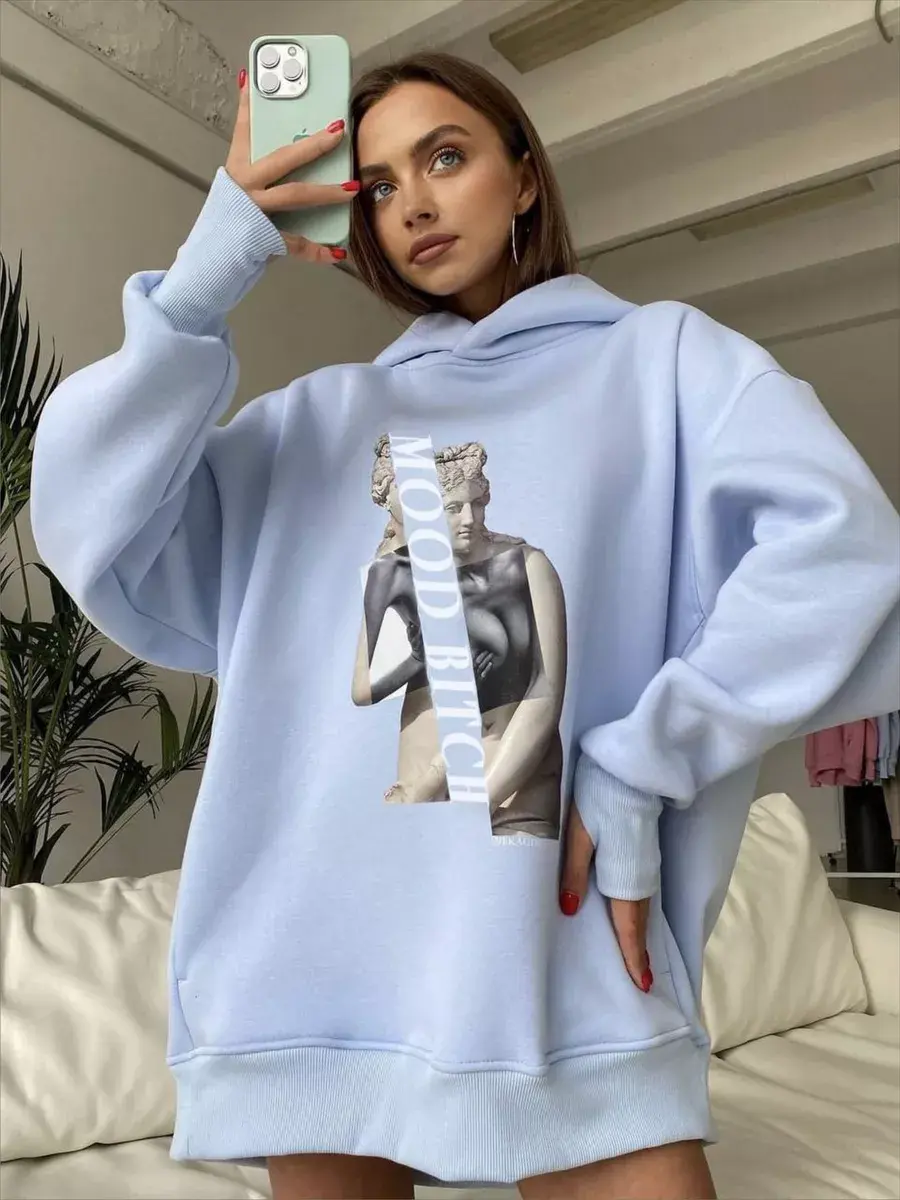 Теплое удлиненное женское худи свободного кроя с объемным капюшоном, спущенным плечом. Оверсайз крой не сковывает движений, изделие хорошо держит форму. Толстовка балахон из трикотажного футера с мягким начесом очень теплая и приятная к телу. Худи одинаково стильно будет смотреться на разных типах фигуры. Олимпийка с капюшоном подойдет для девушек высокого раста и больших размеров. Оригинальный принт сделает данную кофту на флисе самой любимой в вашем гардеробе.