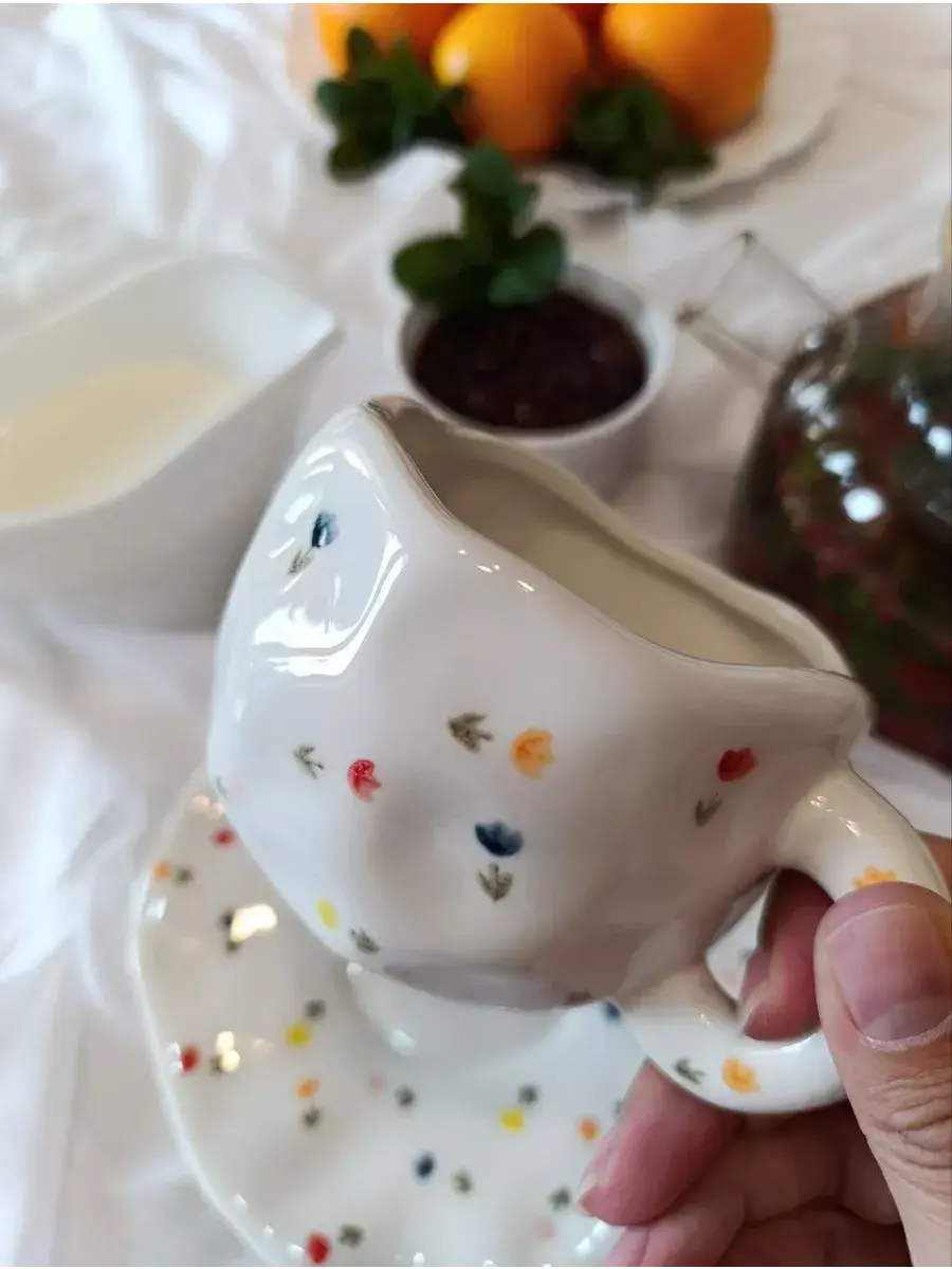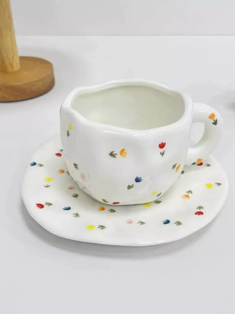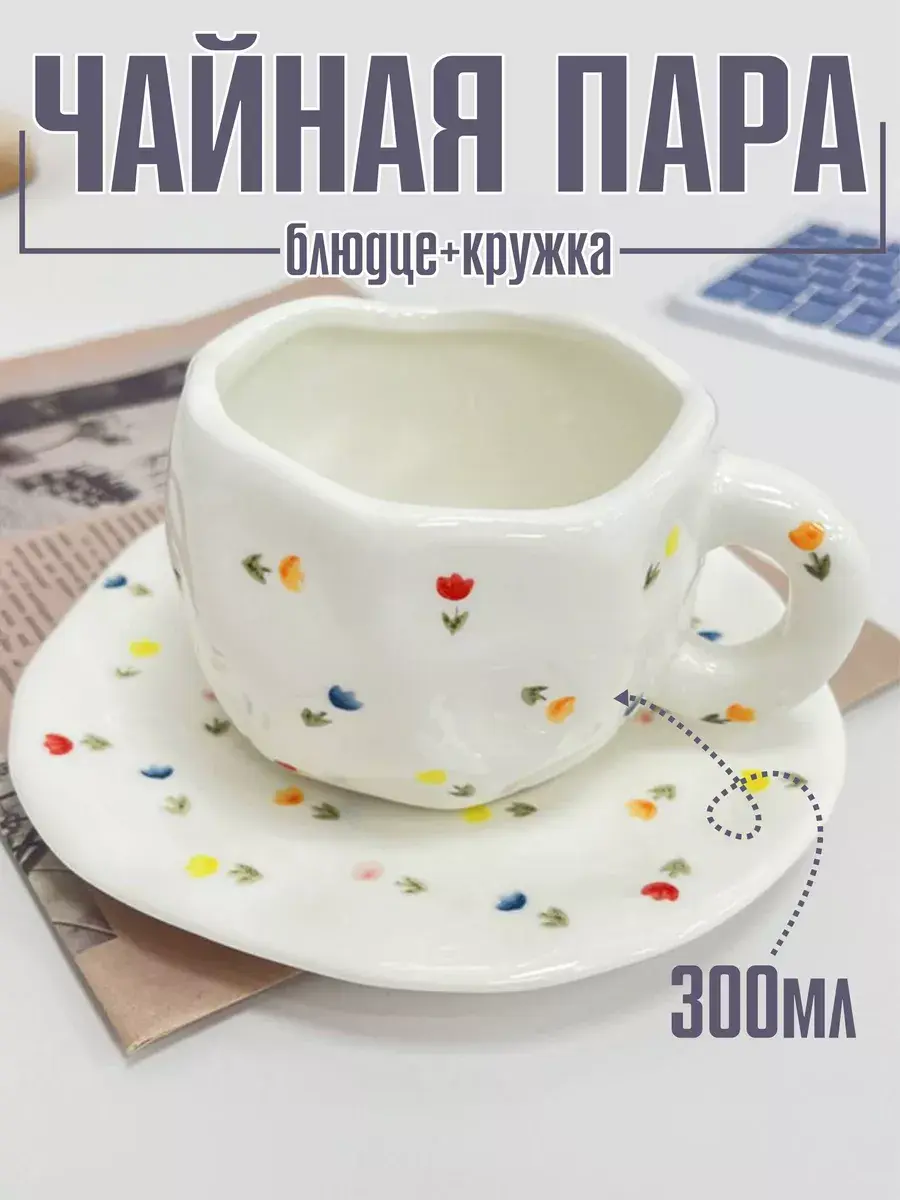 Эта керамическая кружка с блюдцем ручной работы действительно уникальна и привлекает внимание своей необычной формой и яркой росписью. Каждая из них станет настоящим произведением искусства на вашем столе, добавляя уют и индивидуальность к вашему чаепитию или кофейному времени. Белая основа с цветочным узором создает нежный и стильный образ, который будет радовать глаз и душу.