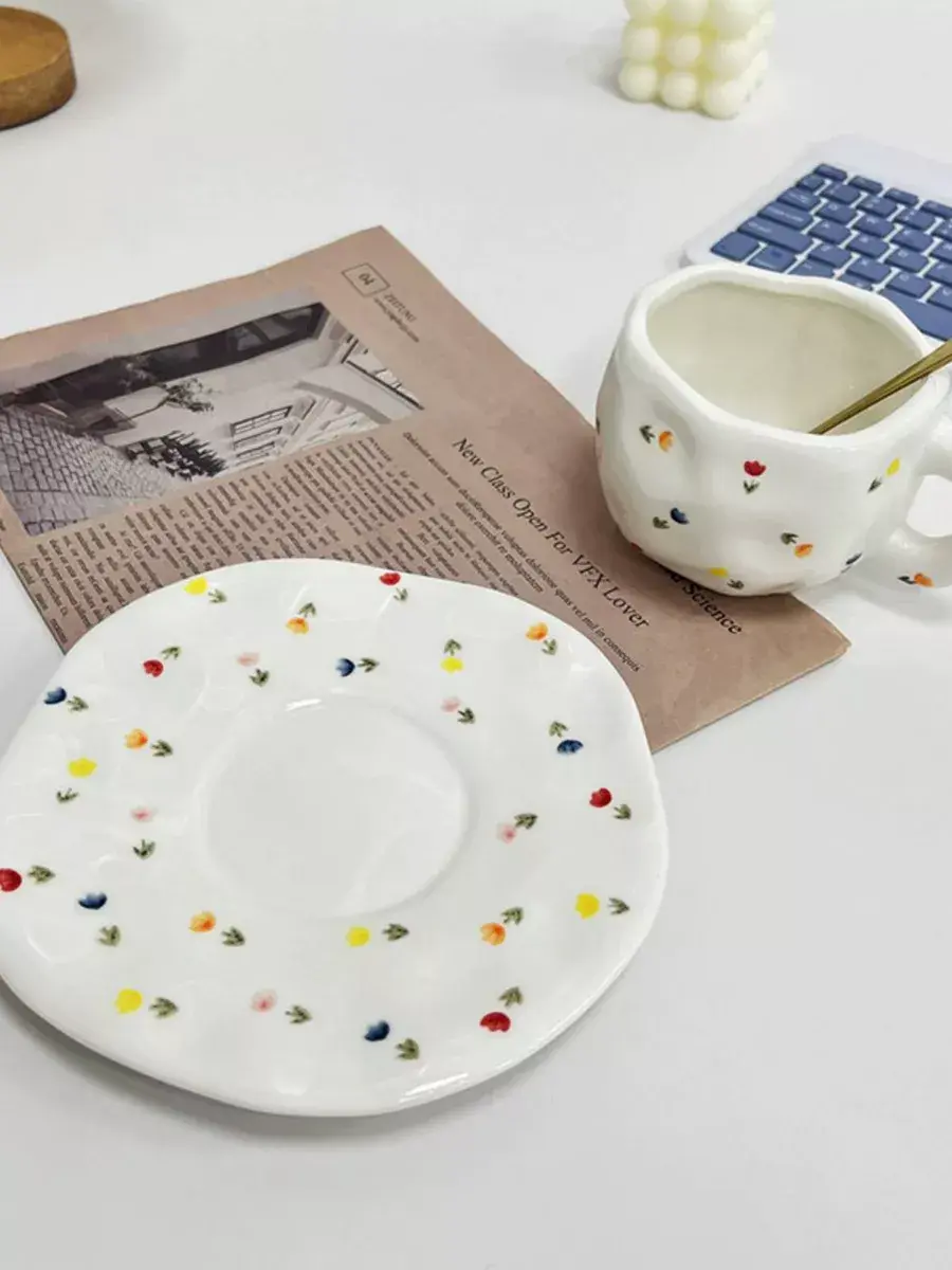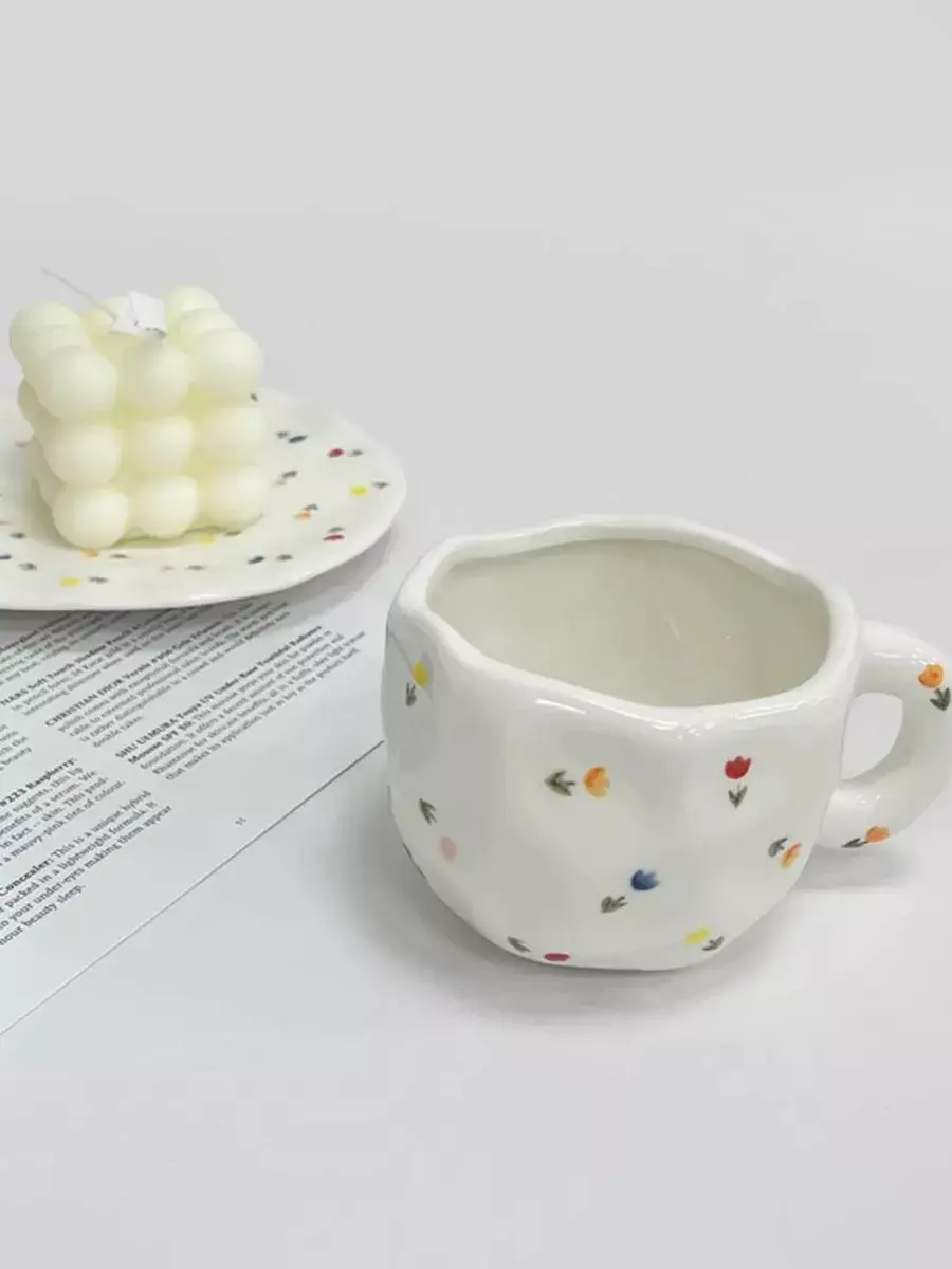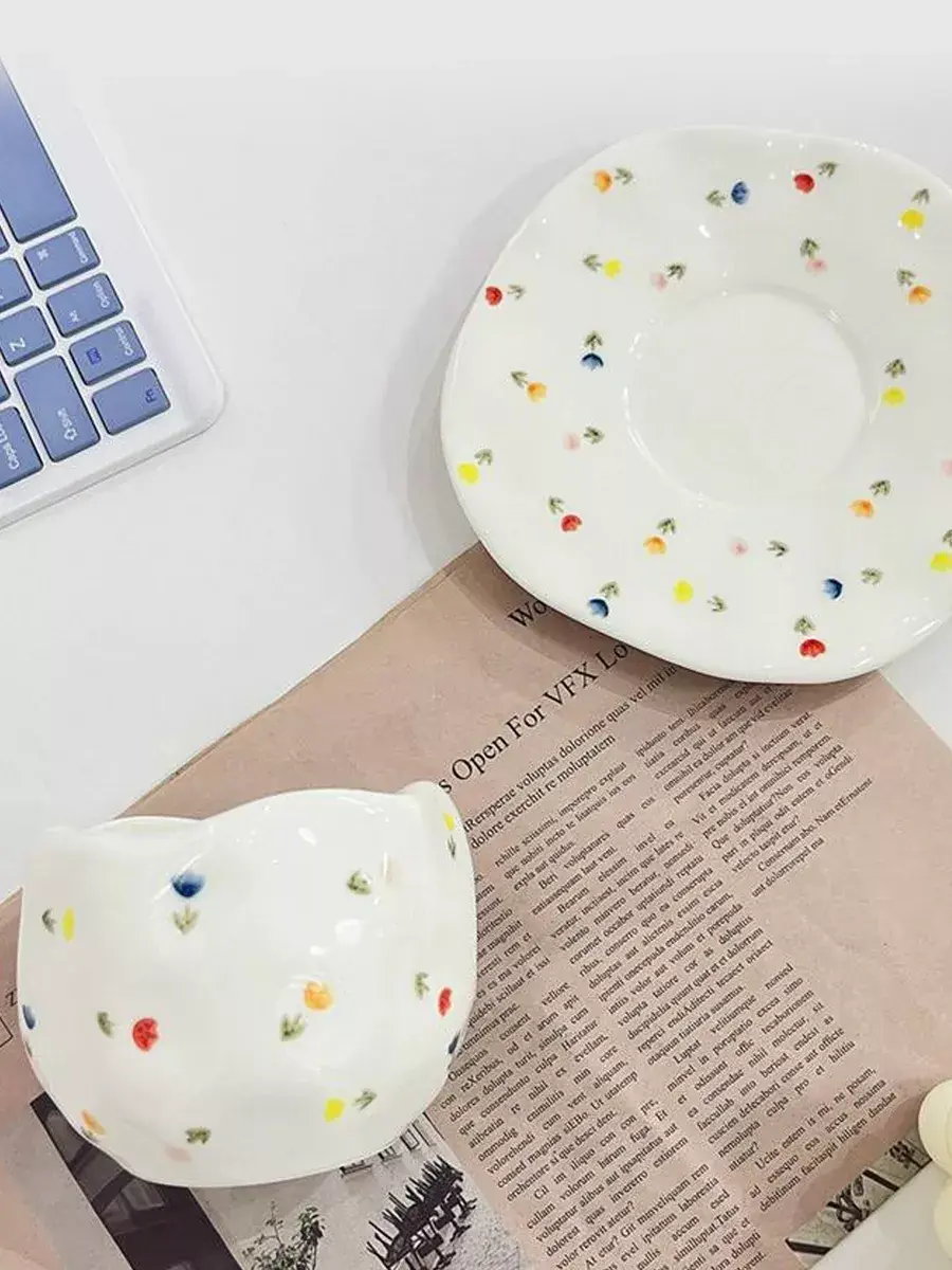 Эта керамическая кружка с блюдцем ручной работы действительно уникальна и привлекает внимание своей необычной формой и яркой росписью. Каждая из них станет настоящим произведением искусства на вашем столе, добавляя уют и индивидуальность к вашему чаепитию или кофейному времени. Белая основа с цветочным узором создает нежный и стильный образ, который будет радовать глаз и душу.