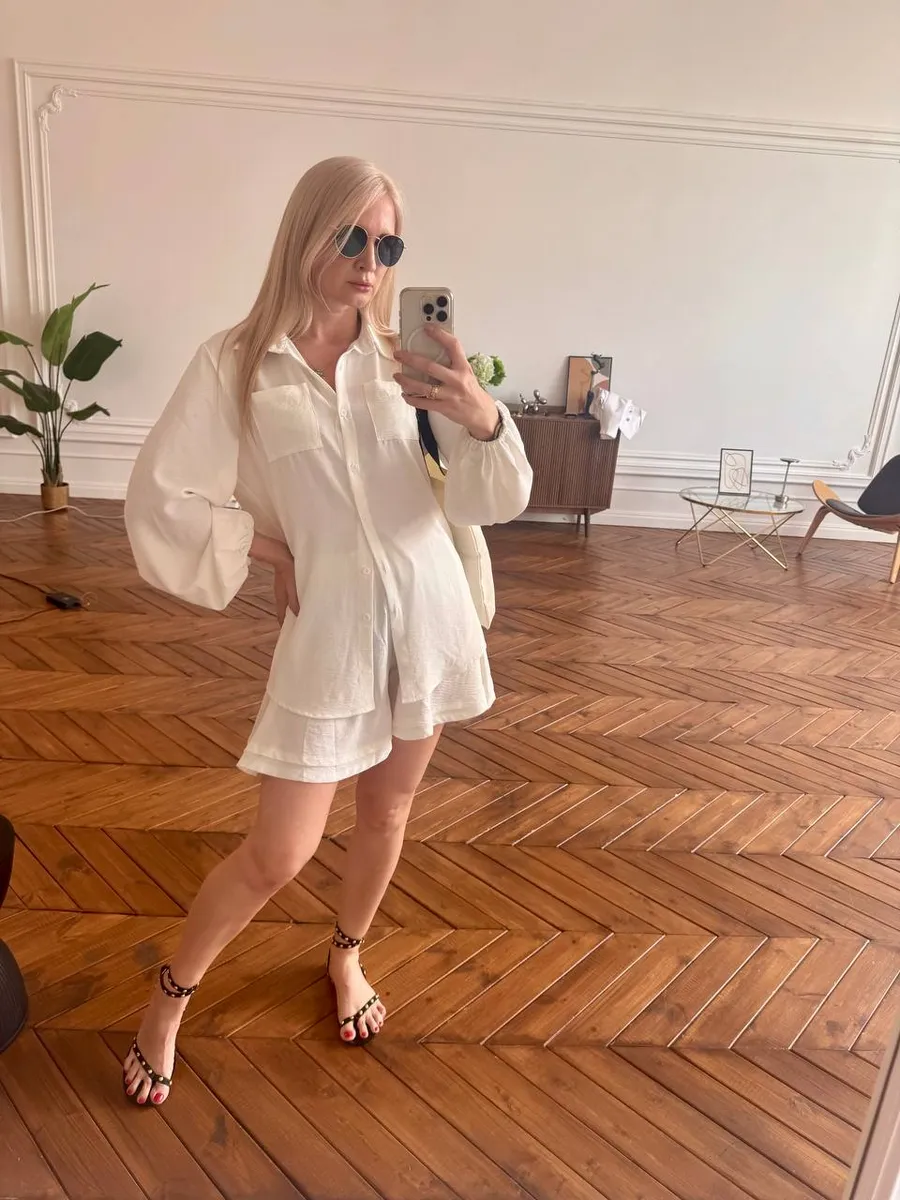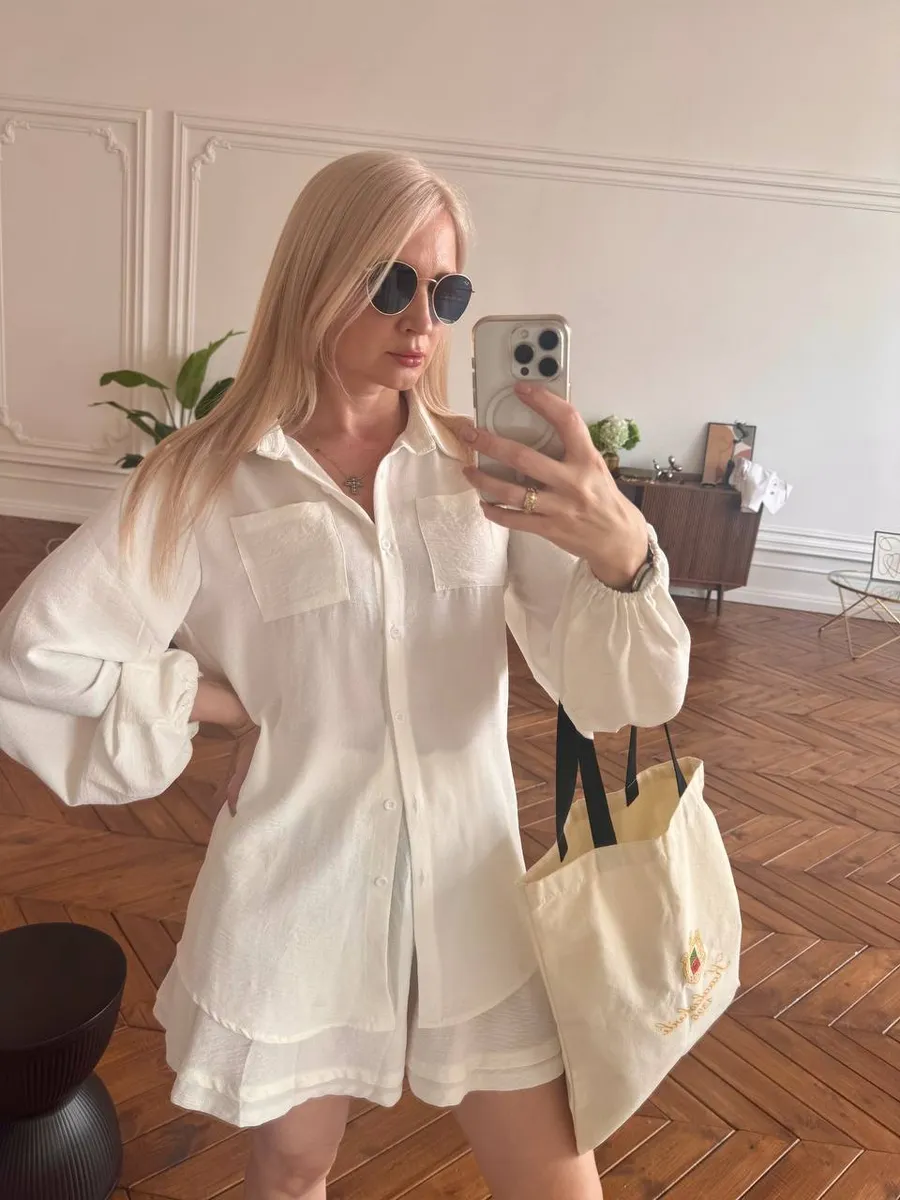 Белый летний костюм с рубашкой и шортами — это сочетание лёгкости, комфорта и универсальности. Свободный крой позволяет чувствовать себя комфортно в жаркую погоду, а стильный дизайн подчёркивает женственность.