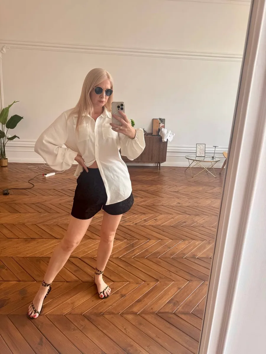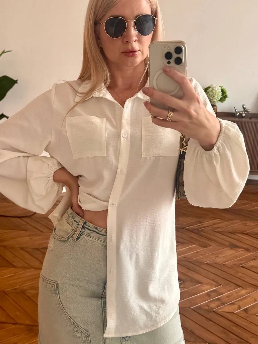 Рубашка с длинными рукавами-фонариками не только создаёт эффектный силуэт, но и защищает от солнца. Её можно носить как на выпуск, так и завязывать на талии, создавая более расслабленный образ. Накладные карманы добавляют удобства, а пуговицы делают модель универсальной — её легко сочетать с разными стилями.