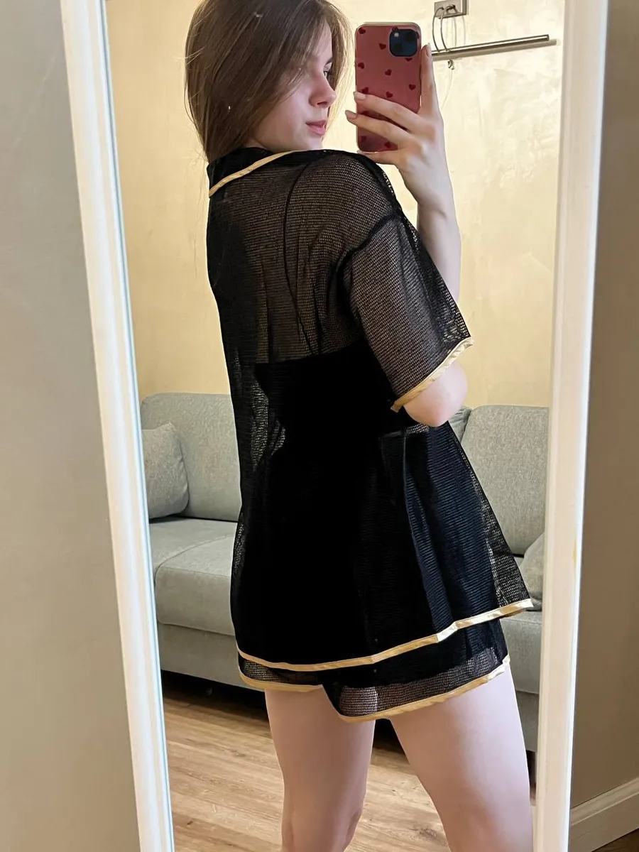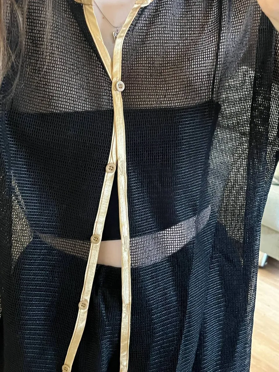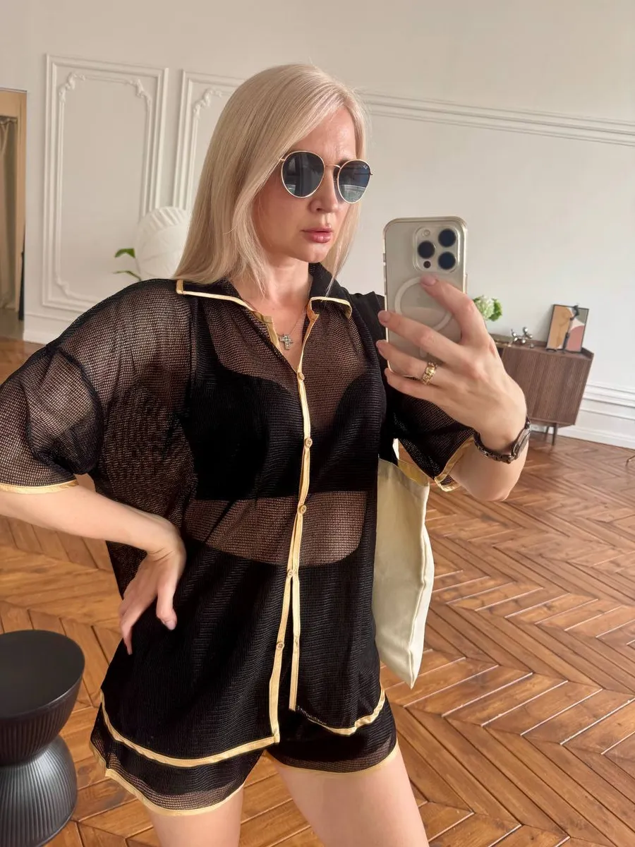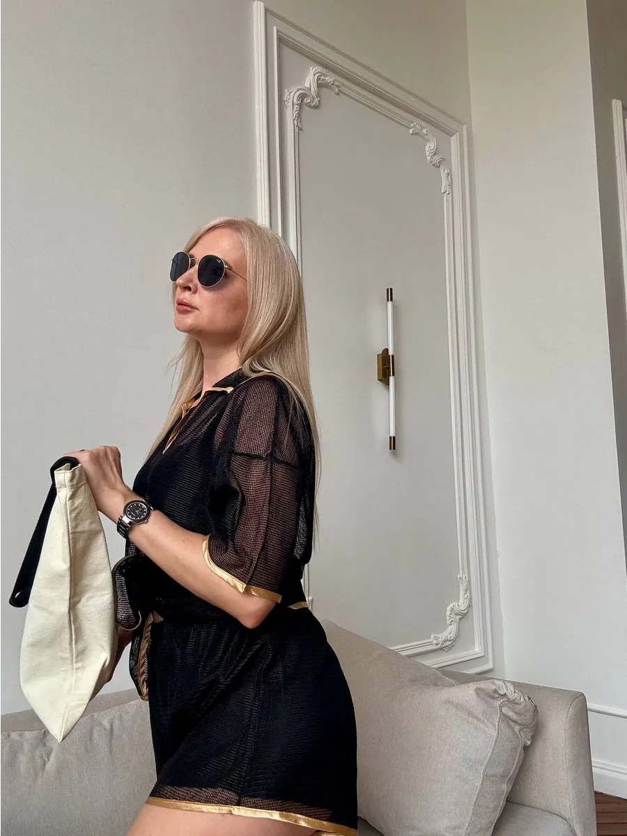 Костюм выполнен из дышащего материала в стиле "кроше", выглядит как паутинка и красиво облегает фигуру. Модель подчёркивает силуэт, оставаясь лёгкой и невесомой — настоящая находка для жаркого лета. Чёрный цвет делает образ элегантным и универсальным, а золотая тесьма по краям добавляет стильный акцент.