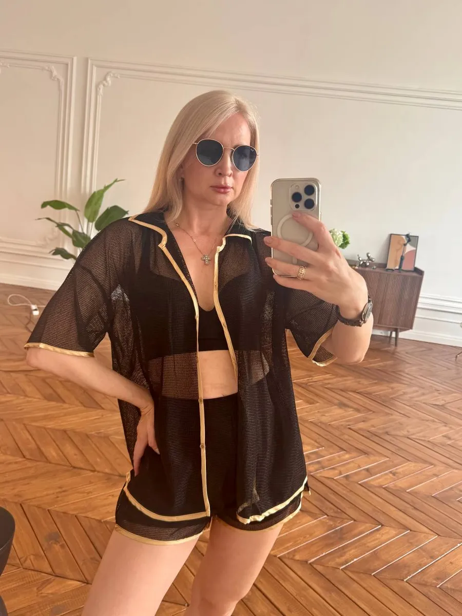 Летний женский костюм-сетка в стиле Pinterest — идеальный выбор для пляжа, отдыха, прогулок и домашнего образа. Верх костюма — вязаная рубашка с коротким рукавом, воротником и застёжкой на пуговицах. Низ — шорты с подкладкой, которые не просвечивают, обеспечивают комфорт и удобную посадку.