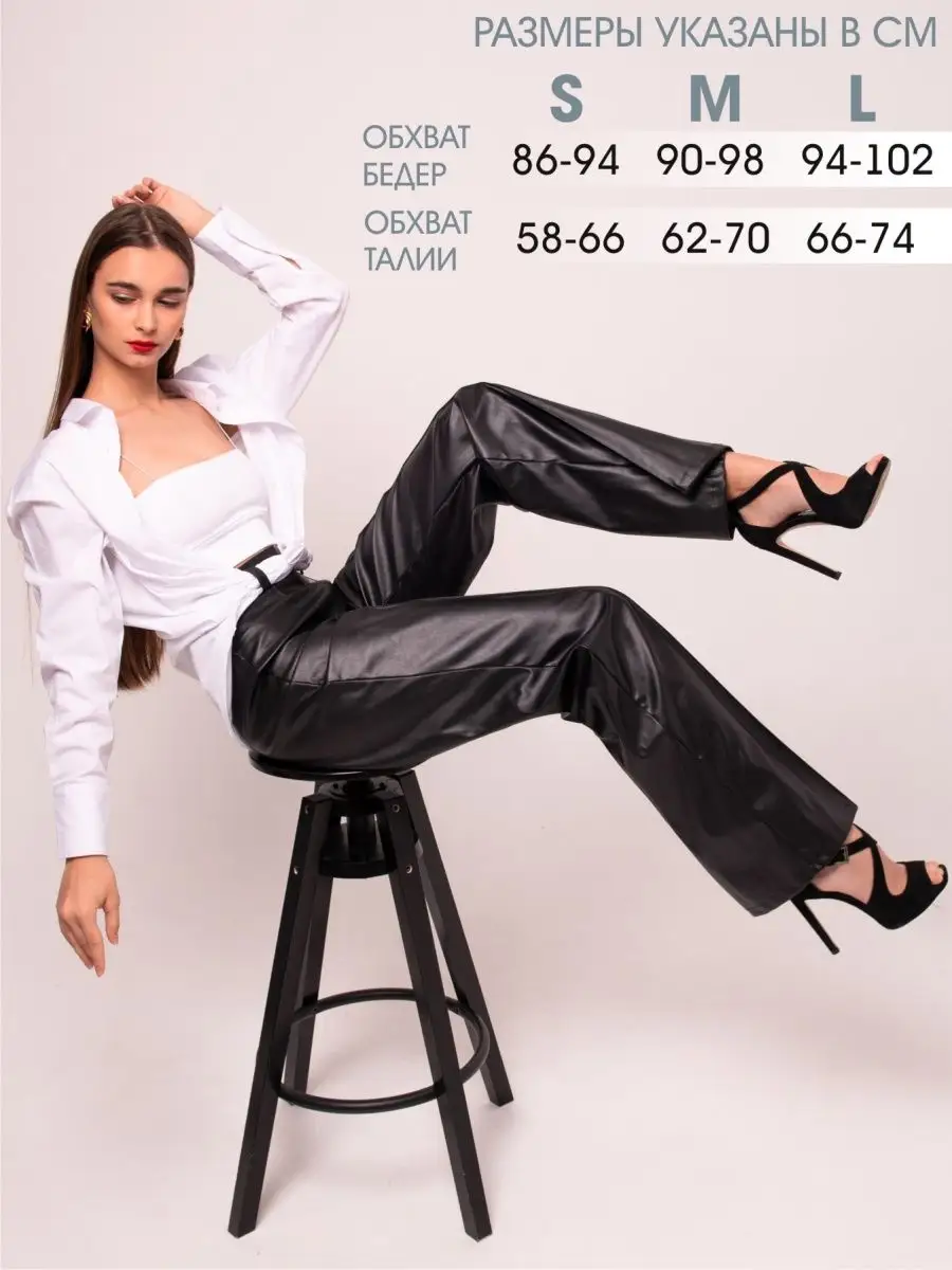 Кожаные брюки Maclo можно носить как в офис, на работу, так и одеть на свидание, ведь благодаря классическому крою и и высокой посадке они отлично справятся с функцией вечерних, нарядных, праздничных брюк. Чёрные брюки из экокожи для женщин отлично впишутся в Ваш гардероб на осенний, весенний сезон. Свободные штаны прямые, повседневные, под кожу, без начеса. Данная модель - модный тренд весна-лето 2024, молодежные облегающие офисные штаны палаццо на каждый день!