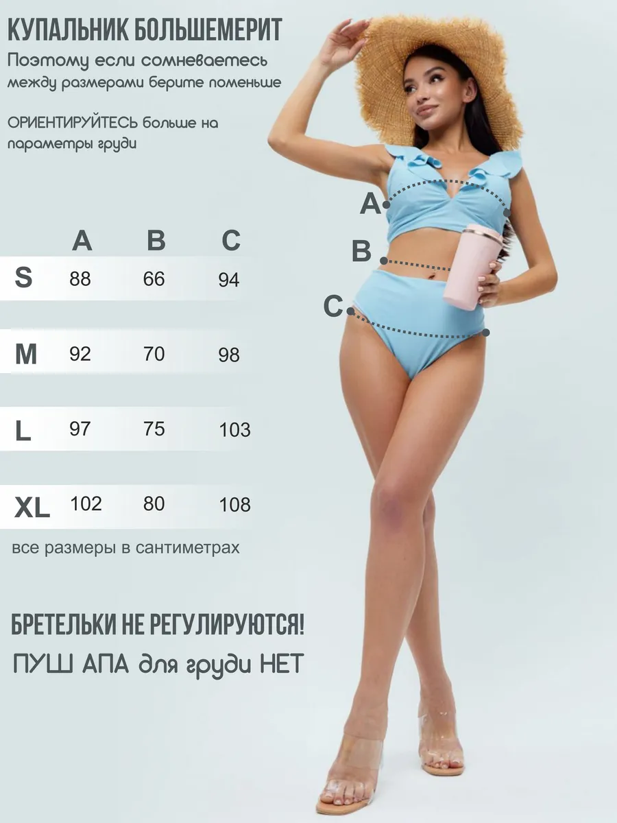 НЕВЕРОЯТНЫЙ! Эффектный раздельный купальник с воланами, состоящий из лифа в виде топа, и трусиков бразильяна. Купальник MACLO небесного голубого цвета. ВНИМАНИЕ - КУПАЛЬНИК БОЛЬШЕМЕРИТ НА ПОЛ РАЗМЕРА! ПУШ АП НЕТ!