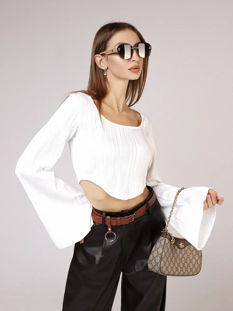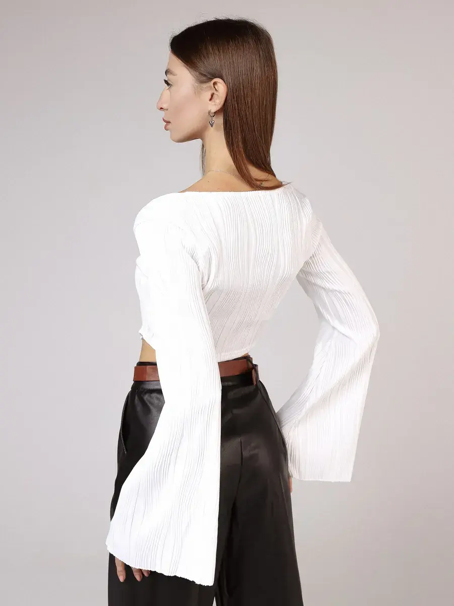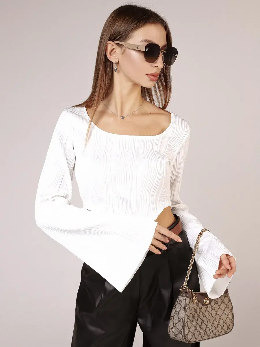 Лонгслив в рубчик с длинными рукавами от бренда MACLO - это идеальный выбор для тех, кто ценит комфорт и стиль в своей повседневной одежде. Этот лонгслив изготовлен из высококачественного полиэстера, который обеспечивает не только долговечность, но и удобство ношения. Особенностью модели является укороченная длина, что делает её идеальной для комбинирования с различными брюками и юбками. Короткий топ не сковывает движения. Белый лонгслив подойдет для девушек и подростков, которые любят стиль y2k, kgirl для школы. Декоративные складки на фронтальной части добавляют изысканности и элегантности, а длинные рукава защищают руки от холода. Эта кроп топ кофта с расклешенными длинными рукавами станет отличным дополнением к вашей гардеробу, обеспечивая тепло и стиль в любое время года.