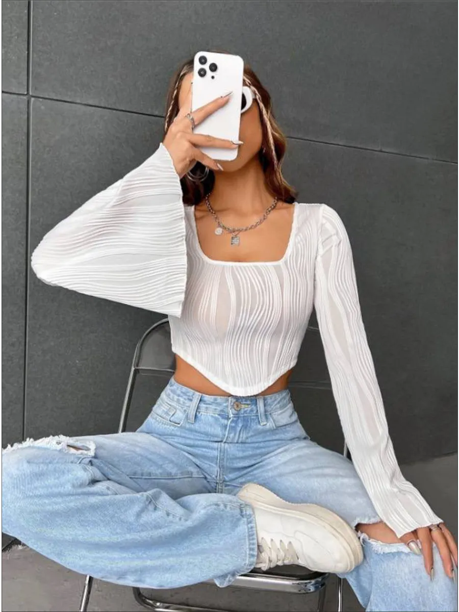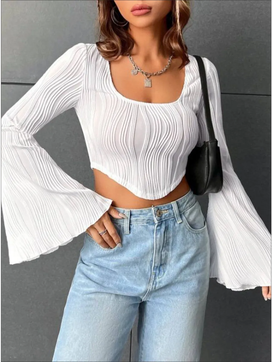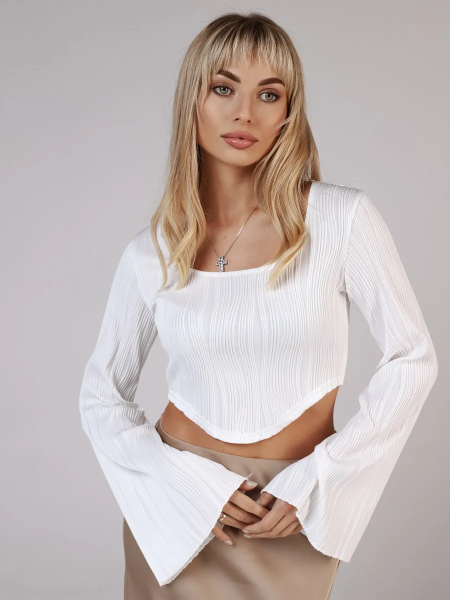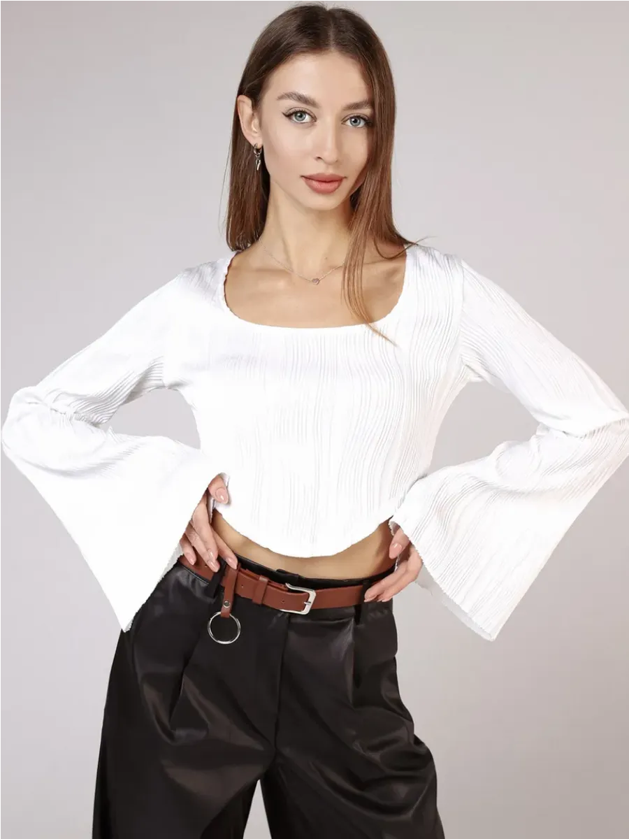 Лонгслив в рубчик с длинными рукавами от бренда MACLO - это идеальный выбор для тех, кто ценит комфорт и стиль в своей повседневной одежде. Этот лонгслив изготовлен из высококачественного полиэстера, который обеспечивает не только долговечность, но и удобство ношения. Особенностью модели является укороченная длина, что делает её идеальной для комбинирования с различными брюками и юбками. Короткий топ не сковывает движения. Белый лонгслив подойдет для девушек и подростков, которые любят стиль y2k, kgirl для школы. Декоративные складки на фронтальной части добавляют изысканности и элегантности, а длинные рукава защищают руки от холода. Эта кроп топ кофта с расклешенными длинными рукавами станет отличным дополнением к вашей гардеробу, обеспечивая тепло и стиль в любое время года.