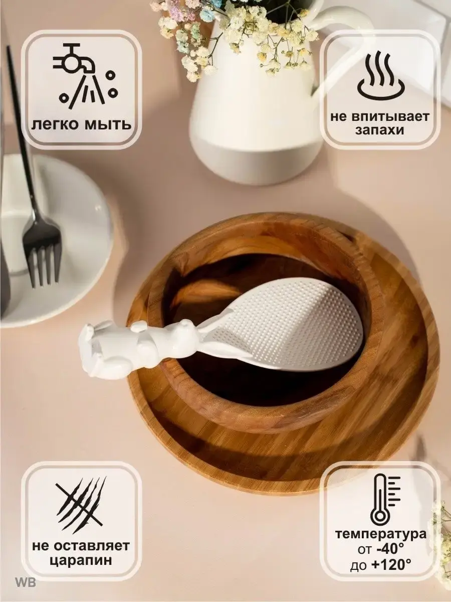 Кухонная ложка предназначена для приготовления различных блюд, а также для подачи готовых блюд и сервировки стола, подачи холодных закусок и салатов. Лопатка стоит на подставке в виде кролика. Украсит вашу кухню и будет милой деталью, которая привлечет внимание гостей. Особенно актуален зайчик к Пасхе. Кулинарная ложка представлена в белом и розовом цветах. Такую кухонную ложку можно использовать для мультиварки. Лопатка кулинарная изготовлена из безопасного пищевого пластика (РР) и пшеничного волокна. В комплекте - лопатка для кухни 1 шт. Кухонная утварь в виде лопатки для кухни с кроликом станет хорошим подарком для подруги на 8 марта, для коллег, для бабушки, на Пасху, для любимой мамы.