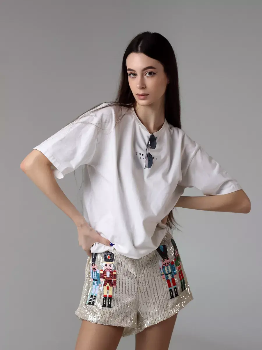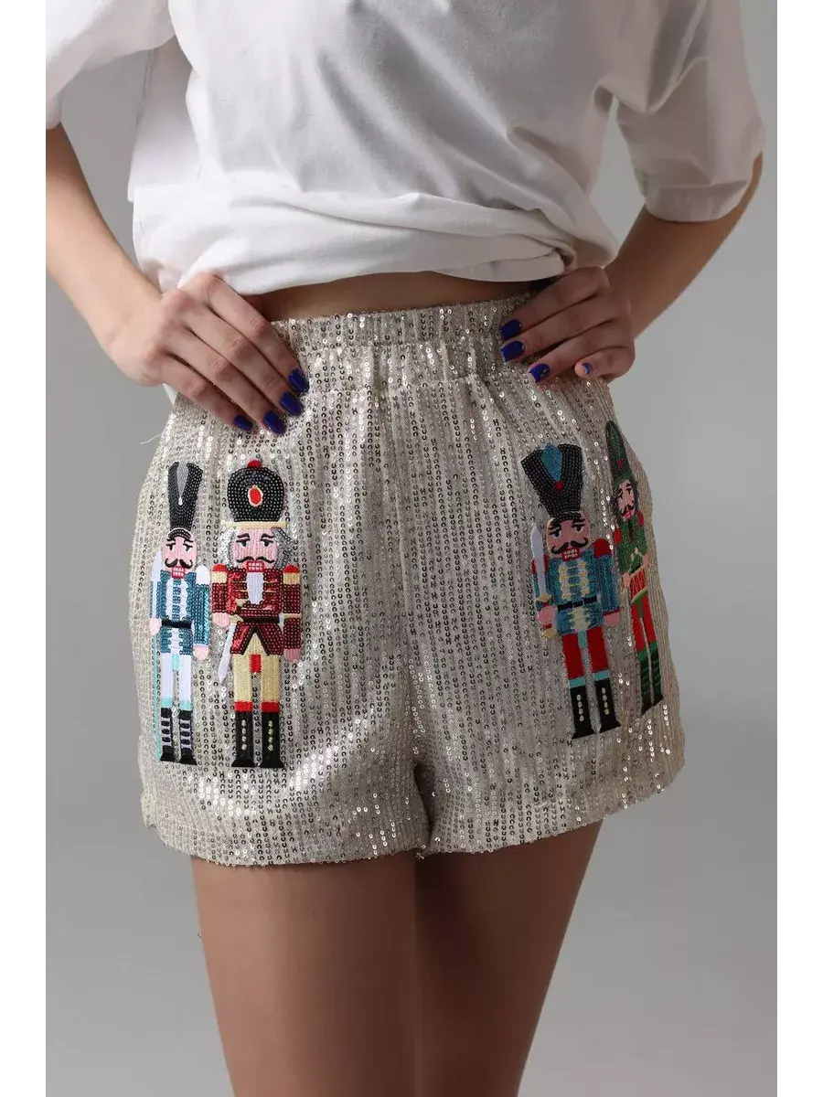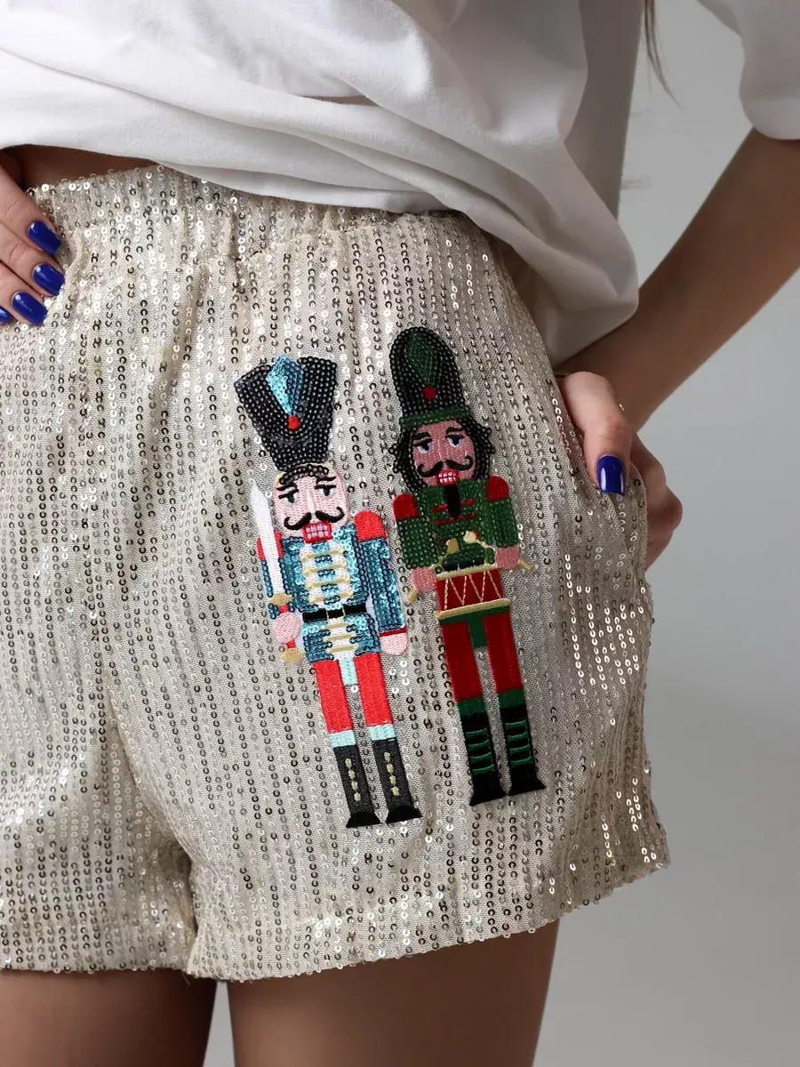Праздничные шорты комфортные благодаря короткой длине и высокой посадке. Такая модель подойдет для создания вечерних и нарядных образов. Бренд MACLO предлагает блестящие летние шорты y2k с принтом щелкунчик.
