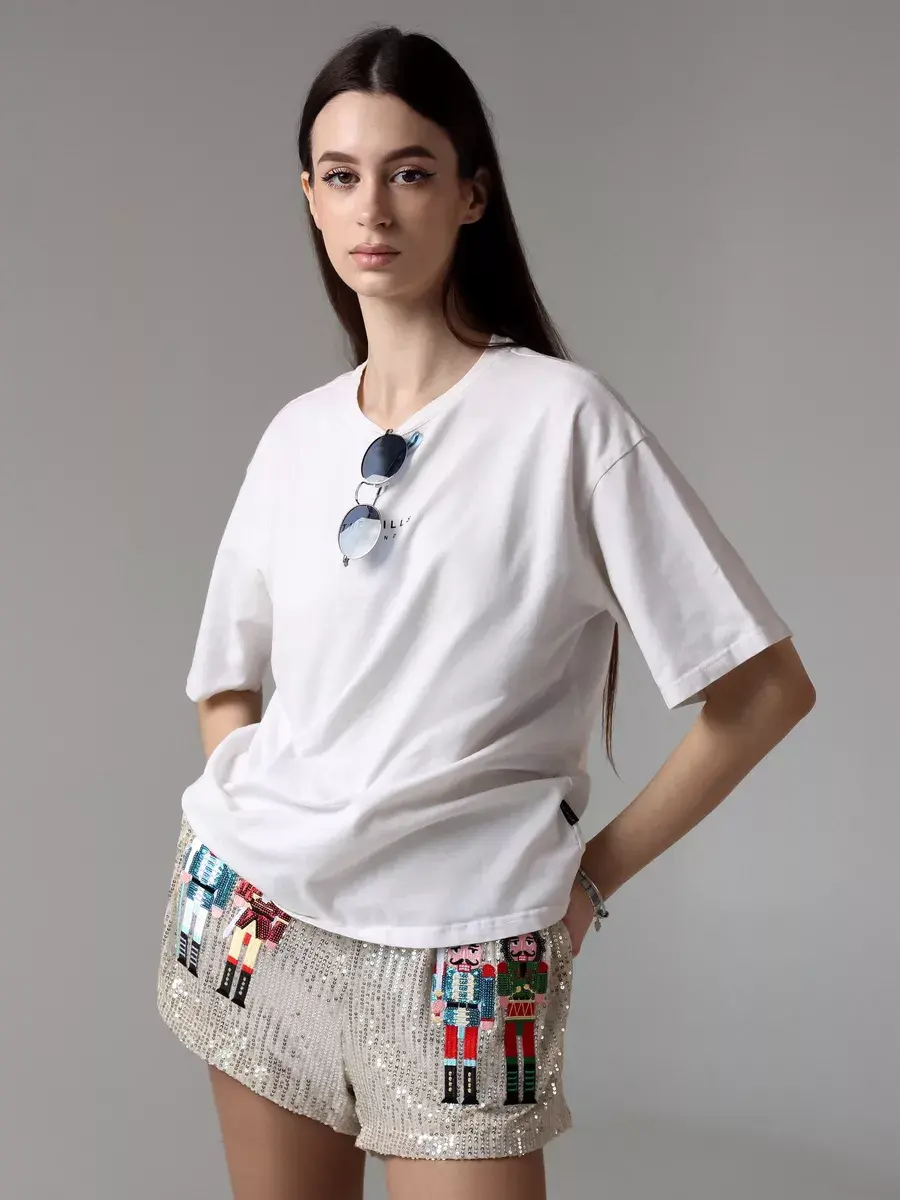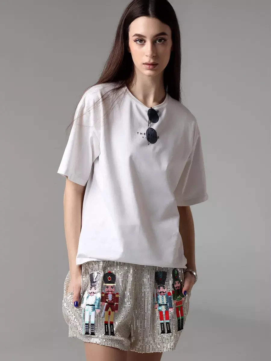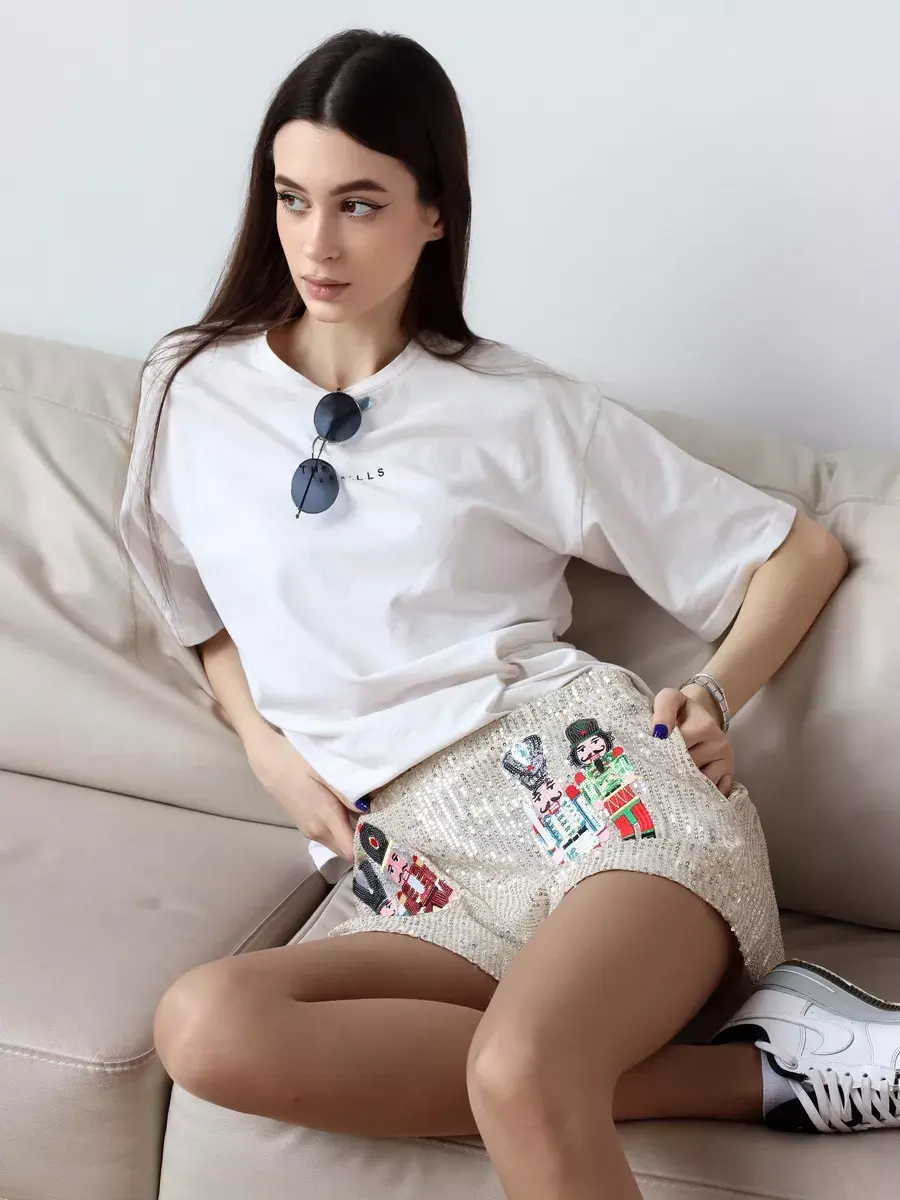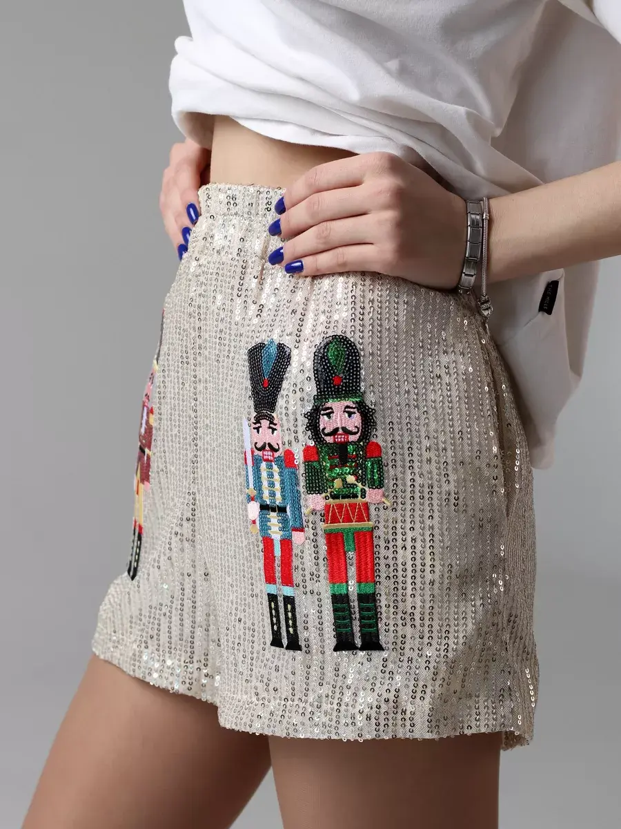 Праздничные шорты комфортные благодаря короткой длине и высокой посадке. Такая модель подойдет для создания вечерних и нарядных образов. Бренд MACLO предлагает блестящие летние шорты y2k с принтом щелкунчик.