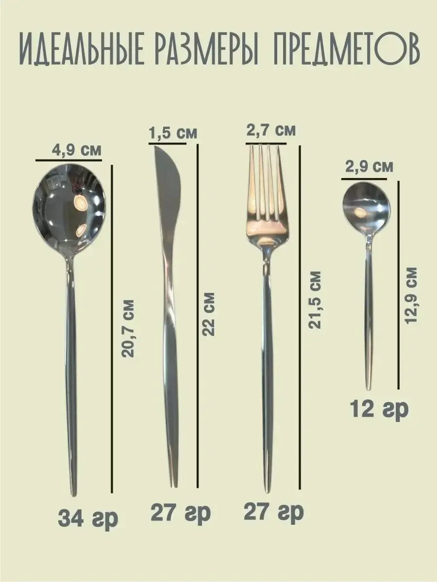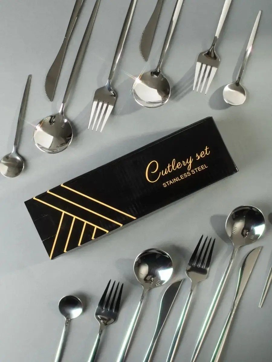 Стильный и лаконичный набор столовых приборов 16, 24 предмета выполнен из высокопрочной, высококачественной нержавеющей пищевой стали премиум качества. Прочные, не гнутся и не царапаются, отлично сохраняют эксплуатационные свойства и внешний вид. Классический дизайнерский комплект ложек и вилок столовых имеет зеркальное покрытие, прекрасно сочетается с любой столовой посудой, поэтому идеально подойдет для эффектной сервировки стола. Использование в посудомоечной машине разрешено на деликатном режиме в использованием мягких экологичных средств для мытья. Цвета серебряные и золотые. По форме ножи и вилки с круглой ручкой, ложки с более плоской. Столовые ножи в наборе имеют острые зубья и легко справятся с нарезкой мяса, овощей и фруктов. Круглая ложка удобна в эксплуатации. Столовые предметы подходят для ежедневного использования, так и для праздничной сервировки стола. Новый подарочный набор столовой посуды упакован в красивую коробку, и будет отличным подарком для кухни каждой женщине бабушке девушке папе маме подруге сестре другу мужчине день рождения юбилей годовщину свадьбы новоселье. Посуда или набор посуды столовой или столовый сервиз или чайный набор - отличная идея женского стильного подарка для дома на любой праздник. Столовые приборы на 4 или 6 персон. Можно использовать как столовый инвентарь для кафе и ресторанов для любых блюд. Набор включает - 6 вилок, 6 столовых ложек, 6 чайных ложек, 6 ножей. Вас порадует нарядная упаковка столовых предметов!