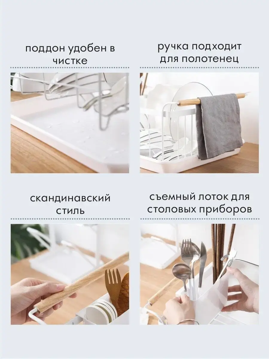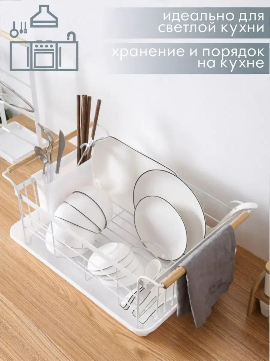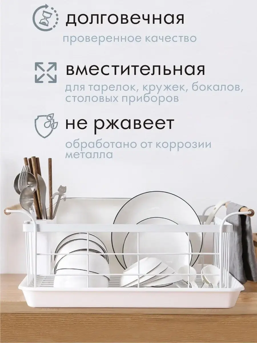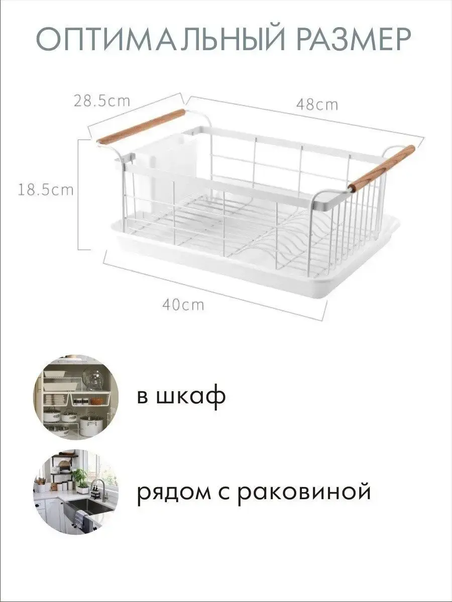 Эта модель имеет ряд преимуществ: вместительная эргономичная, стильная плавные безопасные углы, универсальный размер и белый цвет. Длина 48 см. В такой подставке можно хранить столовые тарелки, столовые приборы, кружки, разделочные доски. Благодаря удобному поддону лишняя влага не будет накапливаться на столешнице вашей кухни, поддон легко снимается и выливается. Этот кухонный инвентарь поддержит порядок на кухне.