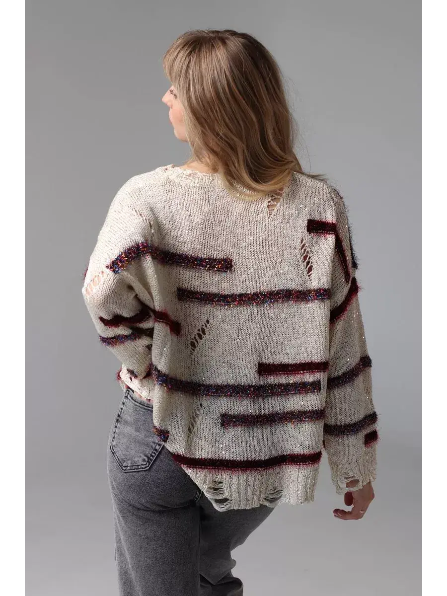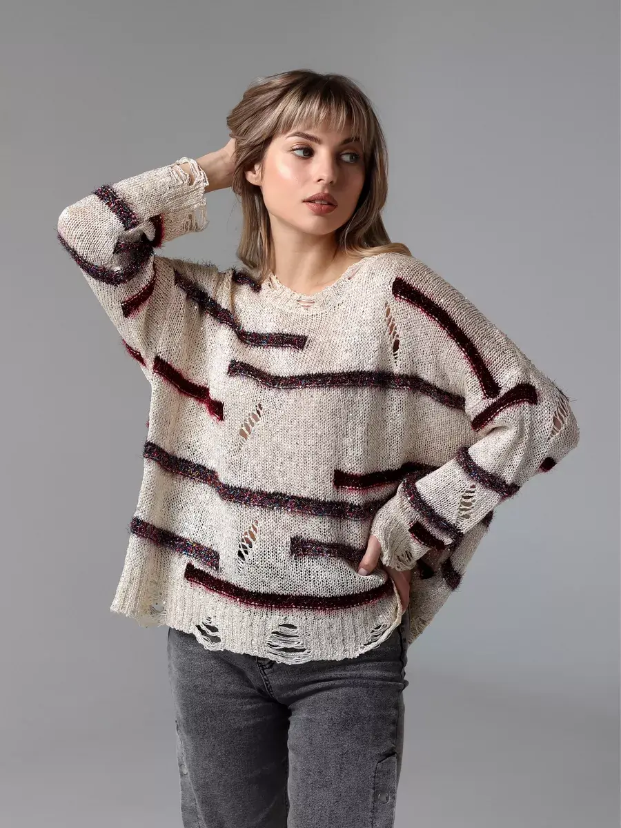 Свитер удлиненный, дырявый и стильный. Вязаный свитер оверсайз в полоску. Свитер с рваными краями придаст особый шарм вашему образу. Теплая и яркая кофта добавит разнообразия в гардероб.
