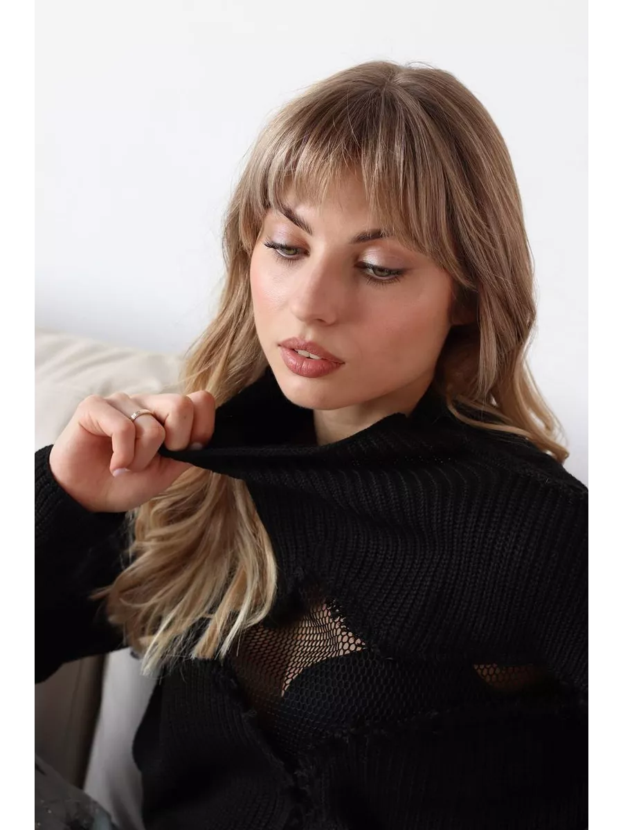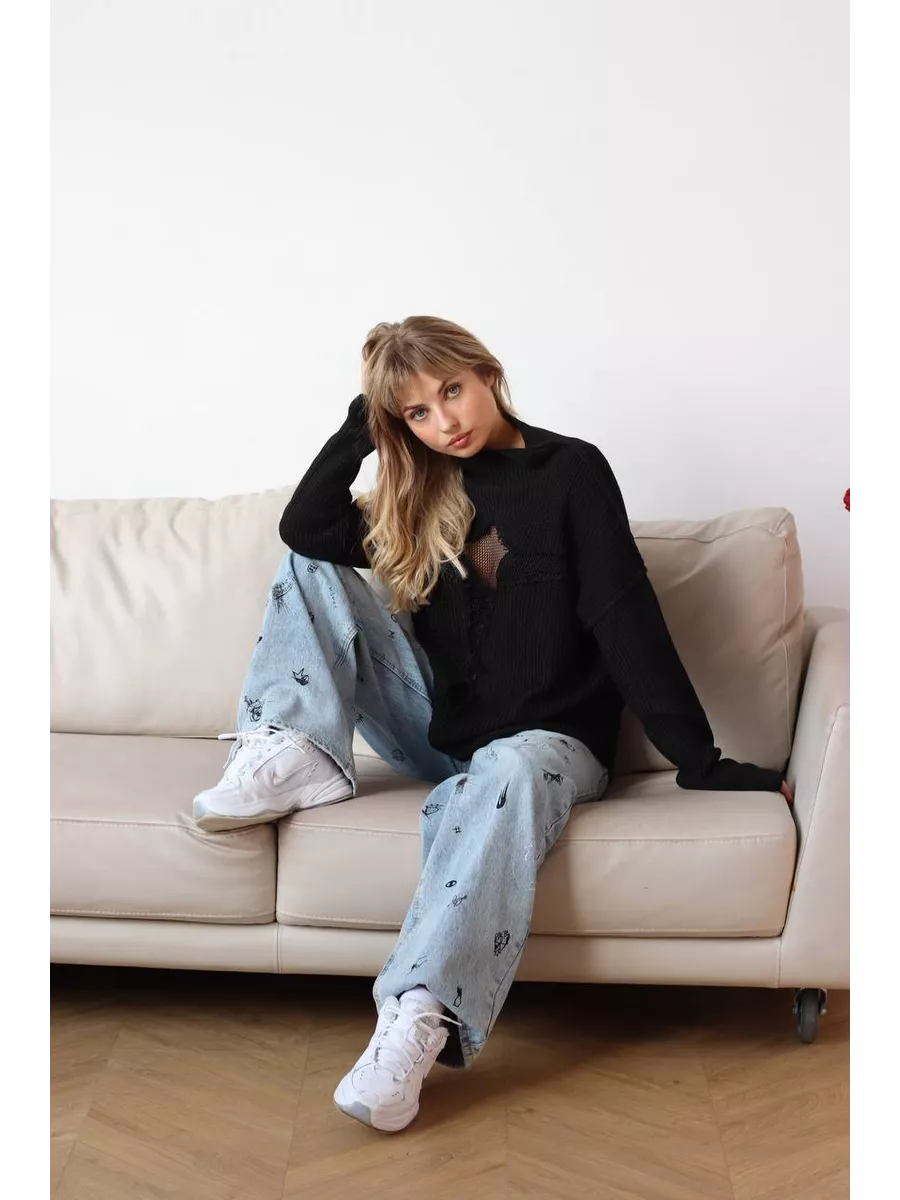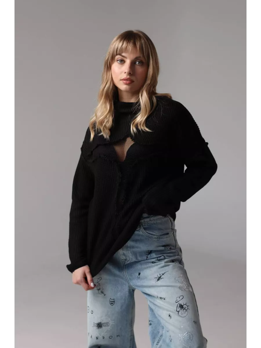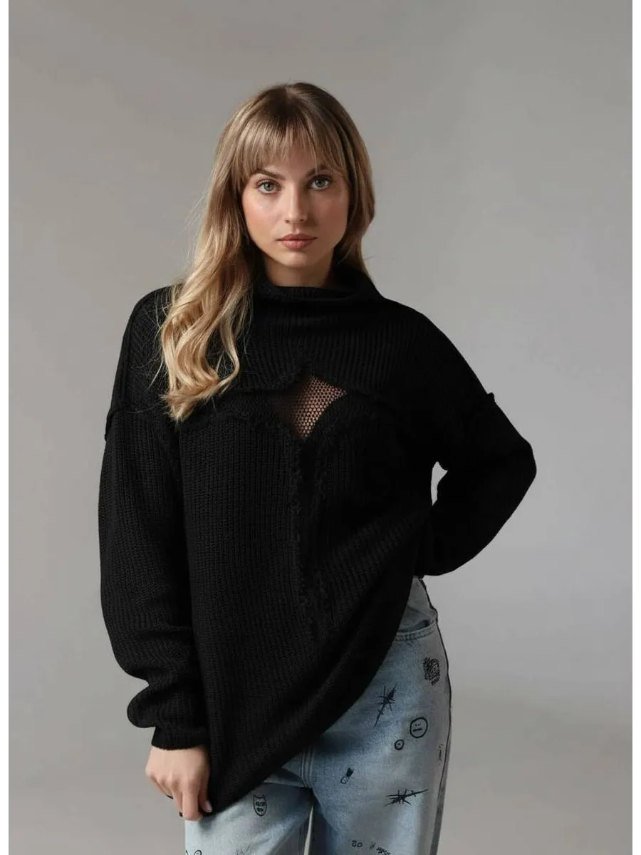 Свитер рваный сетка - уникальная одежда, которая привлекает внимание своим стилем и комфортом. Глубокий вырез и оверсайз размер добавляют элегантности и свободы движений. Свитер с горлом достаточно тонкий и подойдет на прохладный летний сезон.