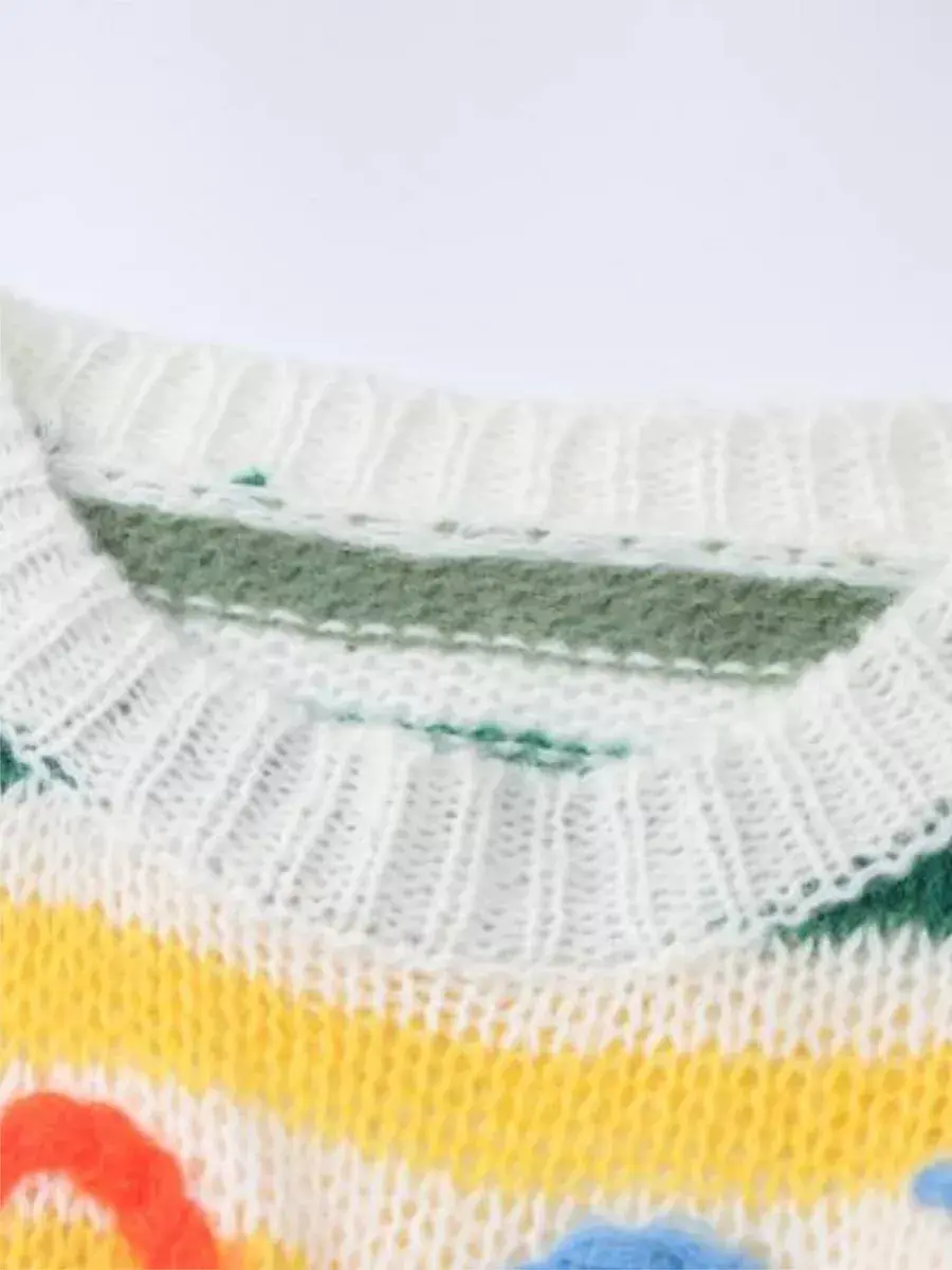 Укороченный крой и рваная текстура с цветным принтом. Вязаный крой в стиле паутинка делает свитер комфортным даже в теплое время года. Мелкая сетка позволит коже дышать. Ажурный джемпер станет отличным элементом гардероба на лето 2025. Желтый цвет кофты подходит для разных случаев и идеально сочетает стиль и комфорт.