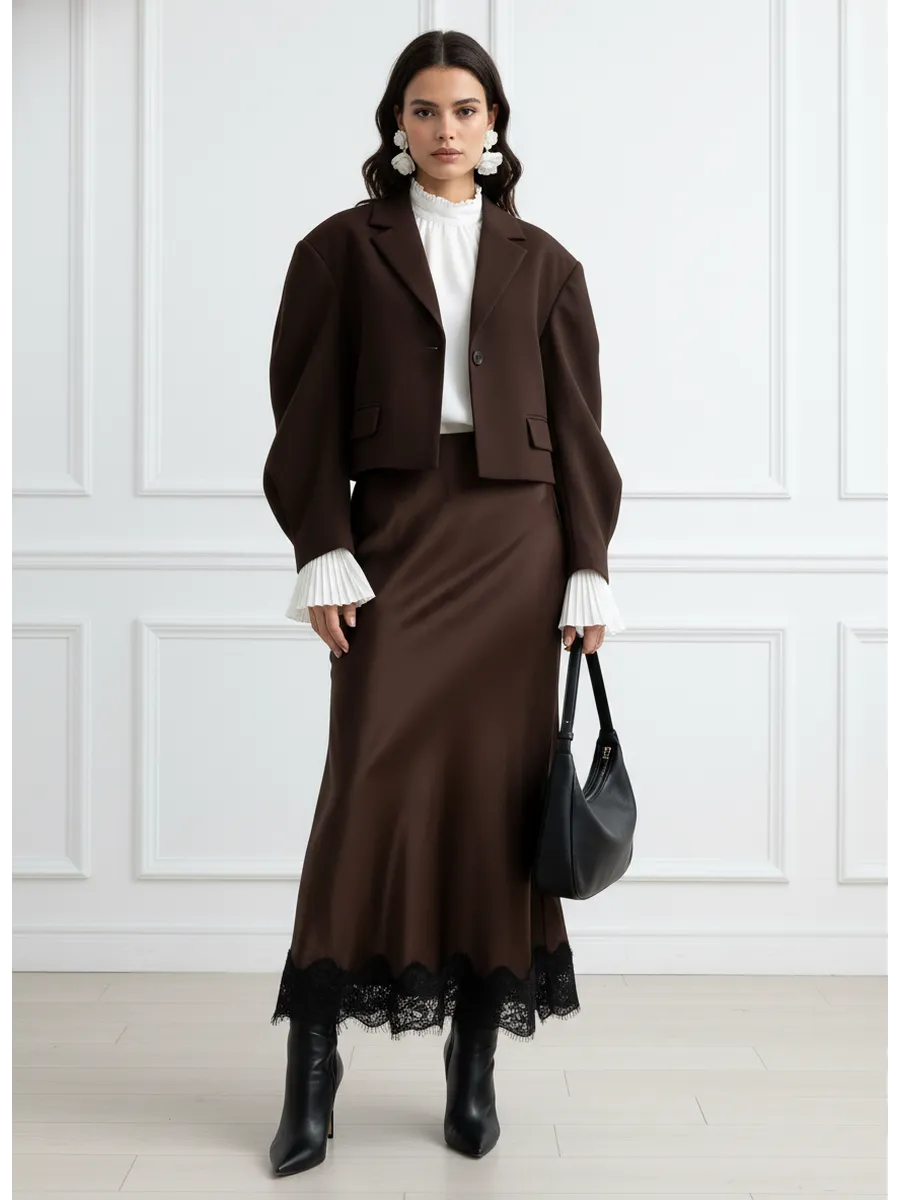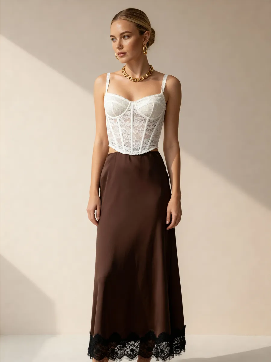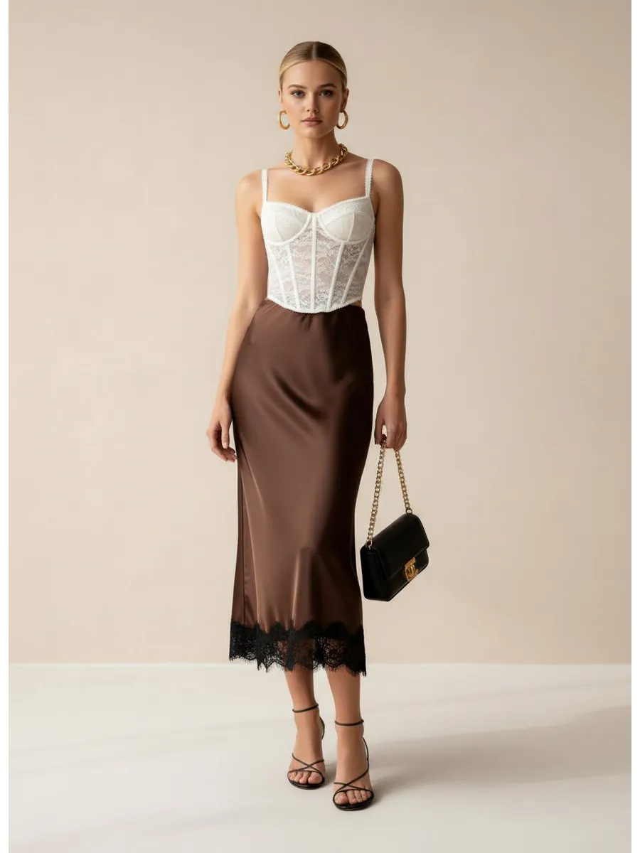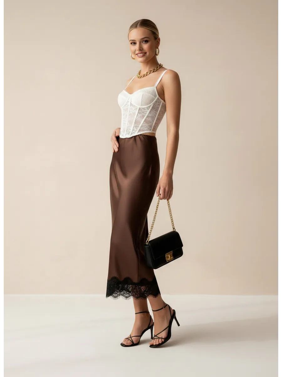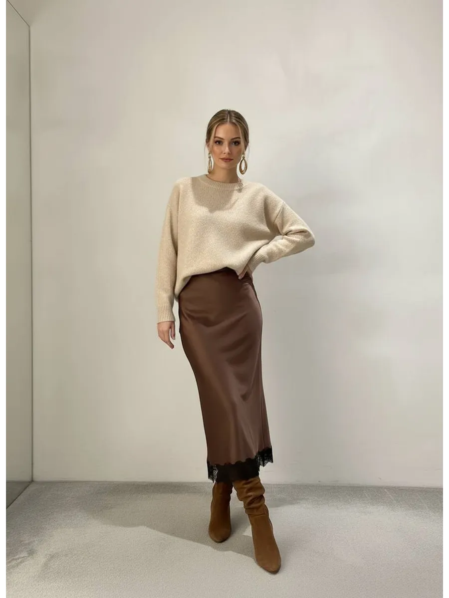 Юбка "На вес золота" - это элегантное и женственное дополнение к любому гардеробу. Сшитая из струящегося атласа, она приятно облегает фигуру, создавая неповторимый силуэт. Декоративное кружево добавляет юбке особый шарм и изысканность. Модель миди длины идеально подходит как для повседневных образов, так и для особых случаев. Коричневый цвет юбки универсален и легко сочетается с различными оттенками верха.